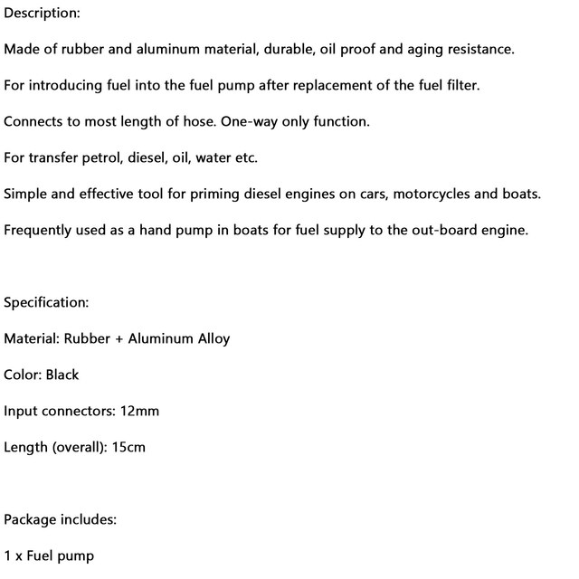 Frequently used as a hand pump in boats for fuel supply to the out-board engine.