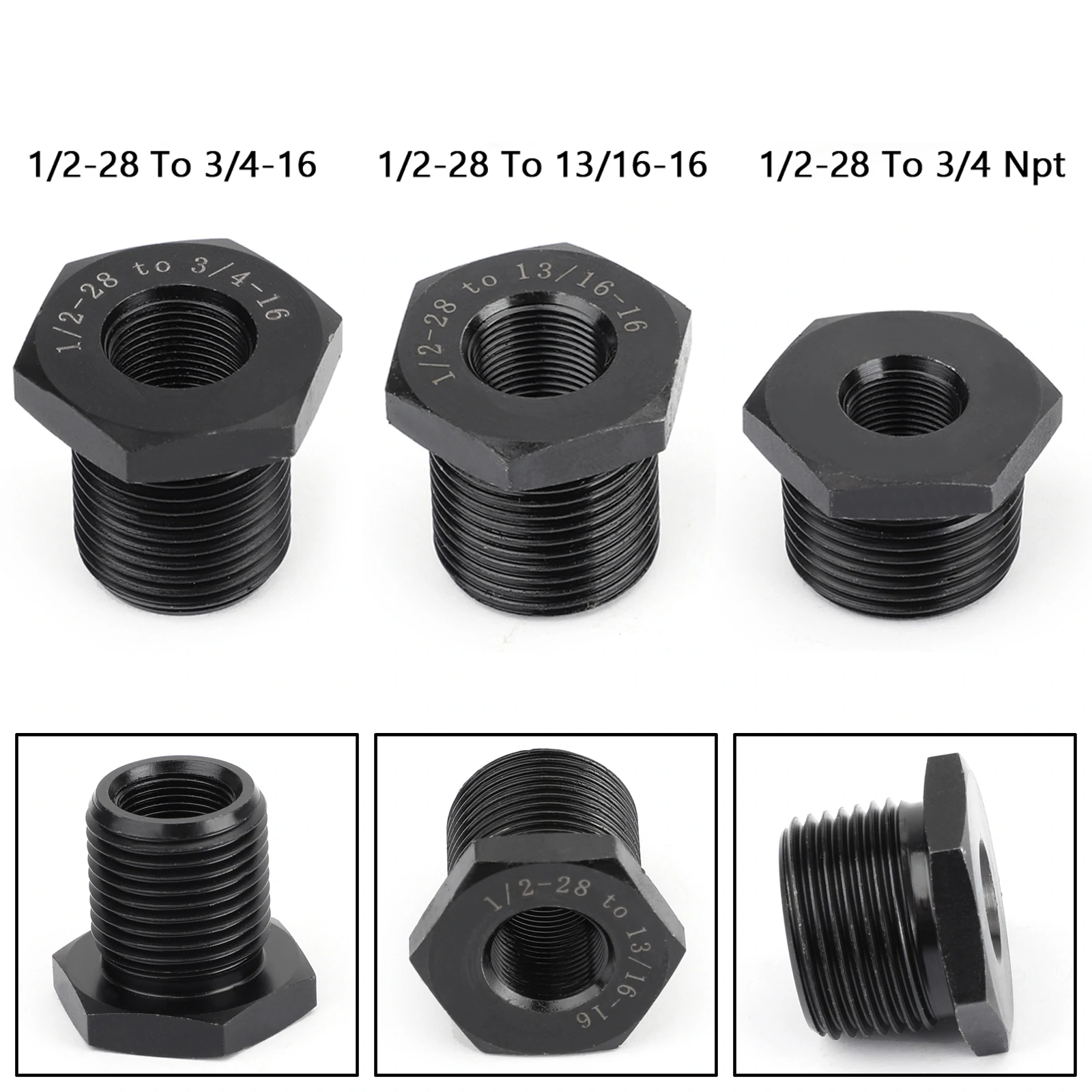 Black 1/2-28 To 3/4-16, 13/16-16, 3/4 NPT Threaded Oil Filter Adapter Anodized Connector